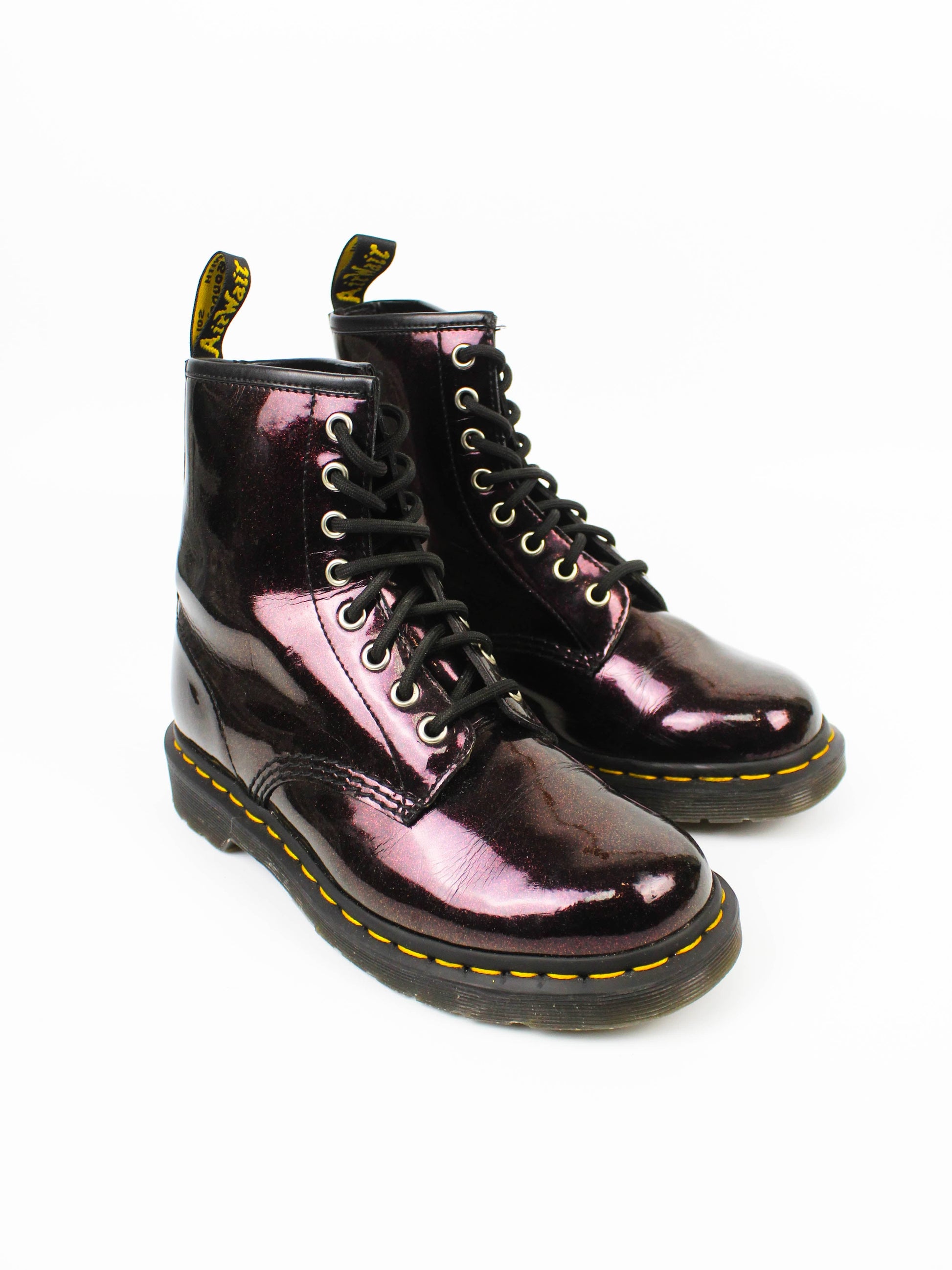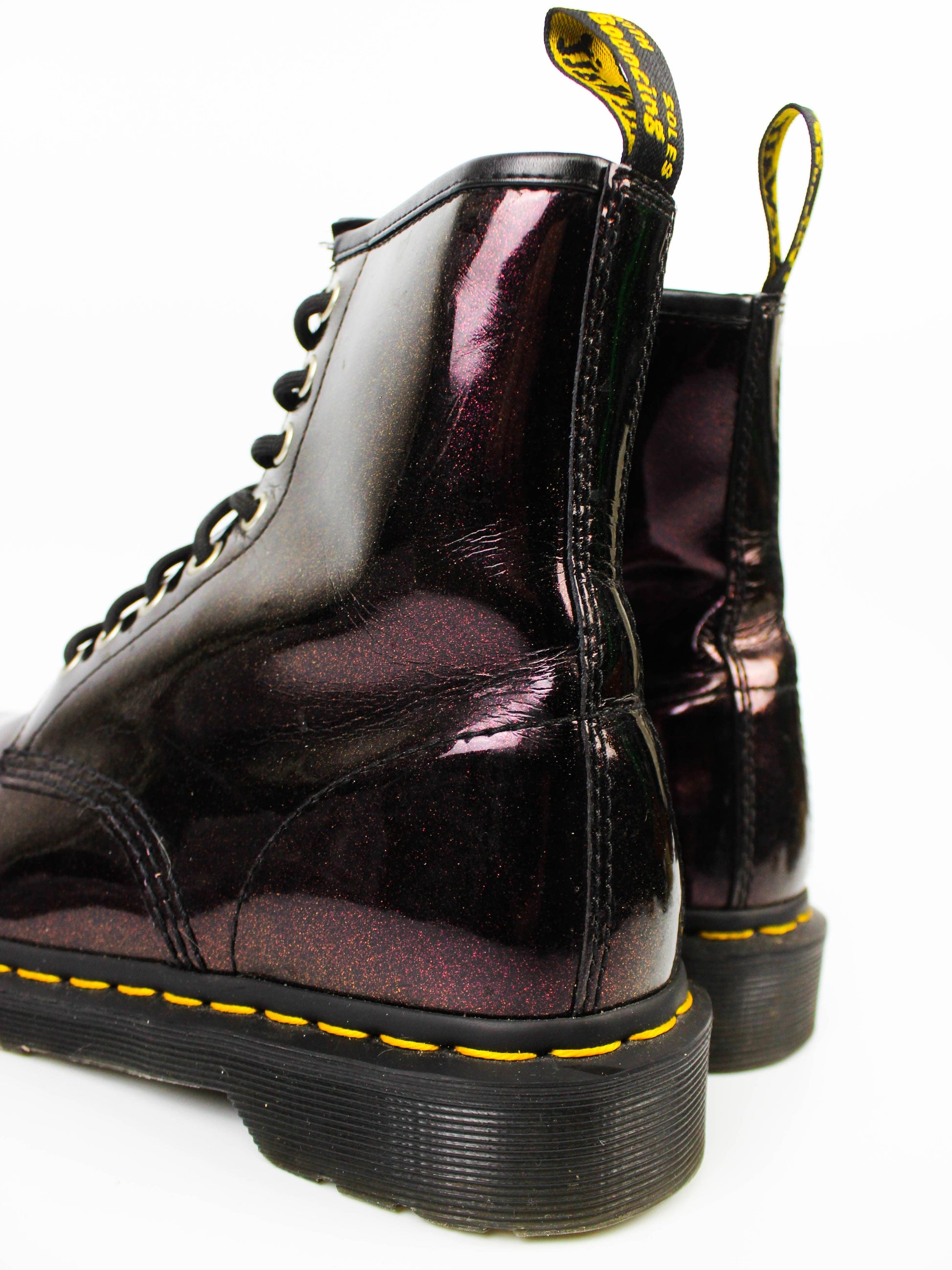 Dr. Martens 1460 Sparkle виготовлені з лаканої натуральної шкіри, покритої блискучими блискітками, що створює виразний і святковий вигляд. Верхня шкіра щільна, добре тримає форму й із часом стає ще комфортнішою при носінні. Підошва зроблена з міцної гуми з класичним рельєфом, що забезпечує стабільність і надійне зчеплення з поверхнею. Класична шнурівка з 8 люверсами надійно фіксує стопу й підкреслює культовий силует моделі. Блискуче покриття робить цю пару помітним акцентом у повсякденному або святковому образі.
